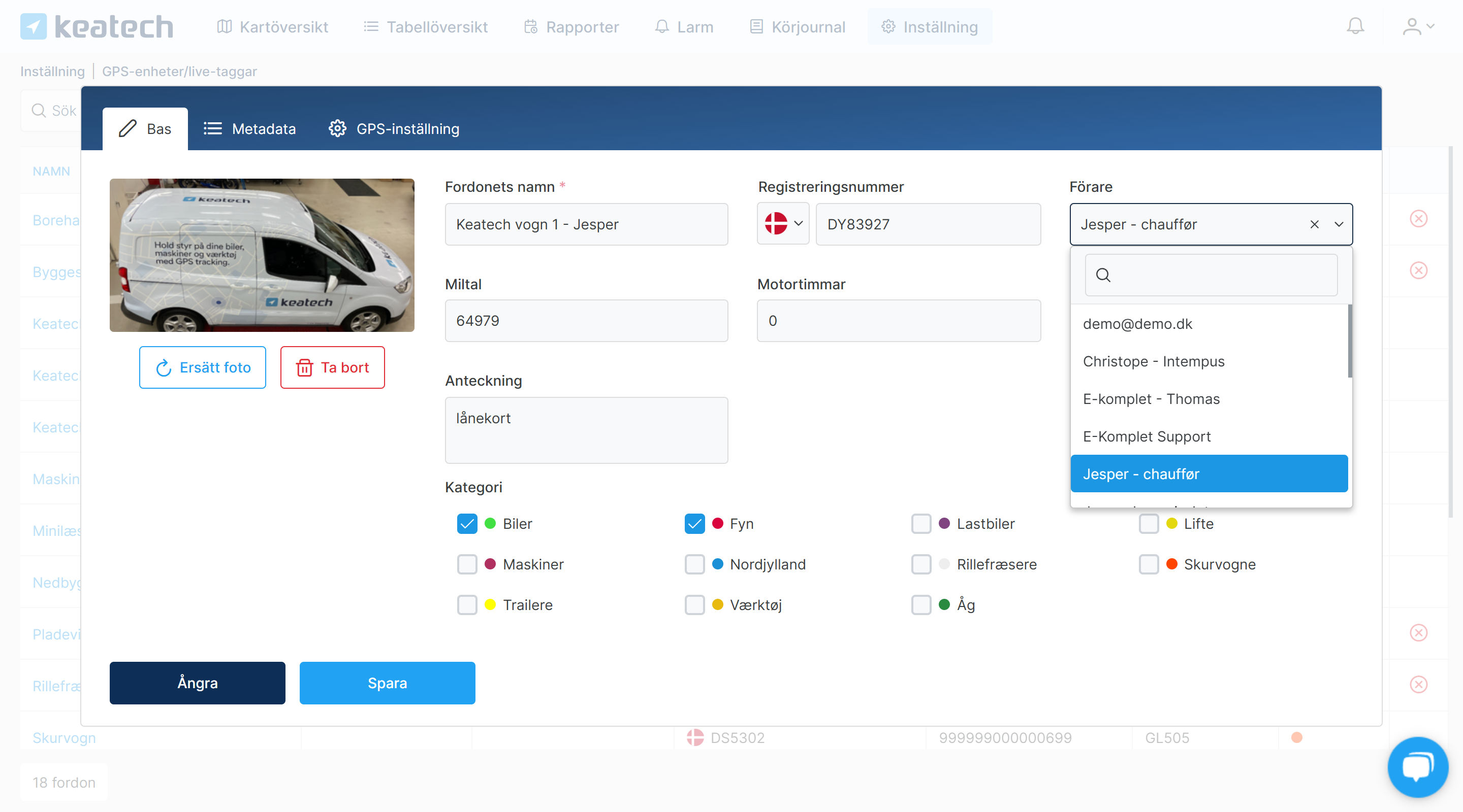 Körjournalen i Keatech LIVE visar resor som registreras av en förare av ett fordon. Det innebär att det första som behöver göras är att koppla en användare/förare till ett fordon.